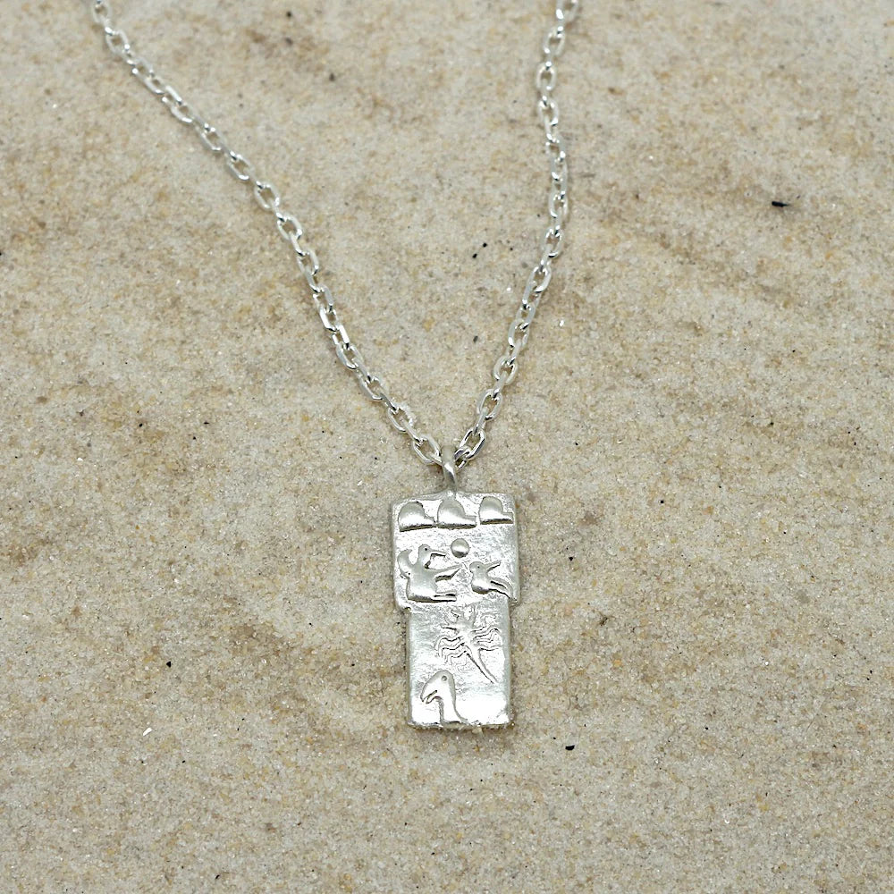 This hand-carved replica of Pillar 43 from Göbekli Tepe in southeastern Turkey evokes the feeling of holding an ancient tablet close to your heart. Like a miniature portal to the past, it invites you to ponder the mysteries of this remarkable archaeological site. Studied for nearly three decades, Pillar 43 is renowned for its intricate carvings, including enigmatic symbols that some researchers believe may encode astronomical information, potentially relating to a calendar or celestial events. Sterling silver handmade charm is on a 16in chain.